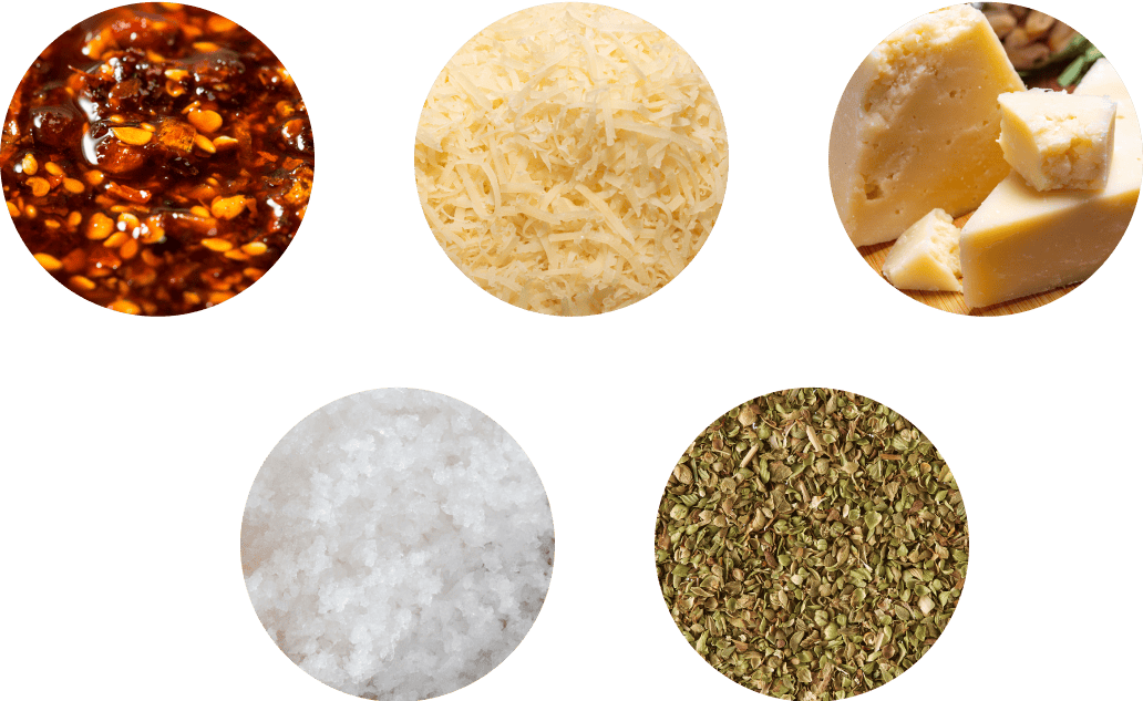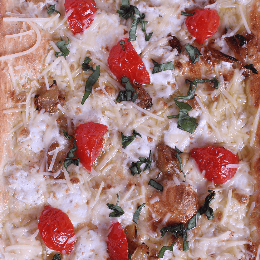 EVOO, Fresh Mozzarella, Mozzarella, 3 Cheese Blend, Roasted Garlic, Tomatoes, Red Onions, Shaved Parmesan, Oregano, and Salt. Looks innocent. Isn’t.